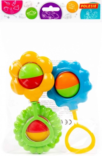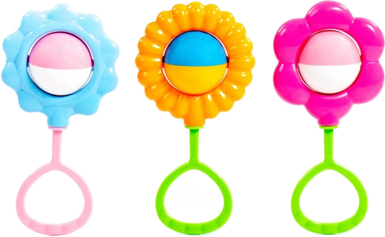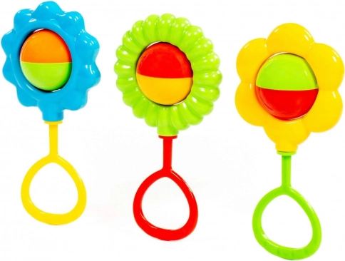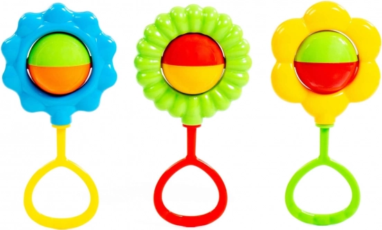 Tri kusy hrkálok vytvarovaných do slnečnice, sedmokrásky a gerbery so žiarivými farbami. Ľahko sa umývajú a skladujú.