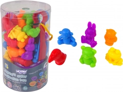 - 36 gumových figúrok zvierat (6 druhov), 6 misiek, 2 klieštiky
