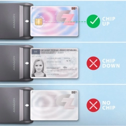 - Poznámka: funguje iba s kontaktnými kartami s viditeľnými kontaktmi, nie s bezkontaktnými RFID.