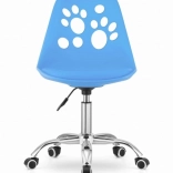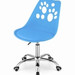 Otočná modrá plastová stolička s kovovým podstavcom a dekoratívnymi výrezmi v tvare labiek, ideálna pre domáce kancelárie či detské izby.