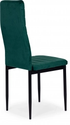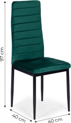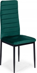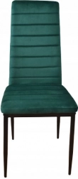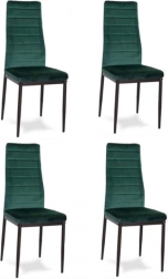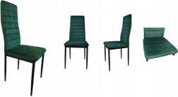 Táto sada štyroch jedálenských stoličiek je ideálnou voľbou pre vašu jedáleň alebo obývaciu izbu. Zaujme vás svojim moderným dizajnom a príjemným na dotyk zeleným zamatovým čalúnením. Vďaka vysokému profilovanému operáku a vysokokvalitnej penovej výplni poskytujú stoličky maximálne pohodlie. Čierne kovové nohy dodávajú stoličkám elegantný vzhľad a zároveň zaručujú stabilitu.