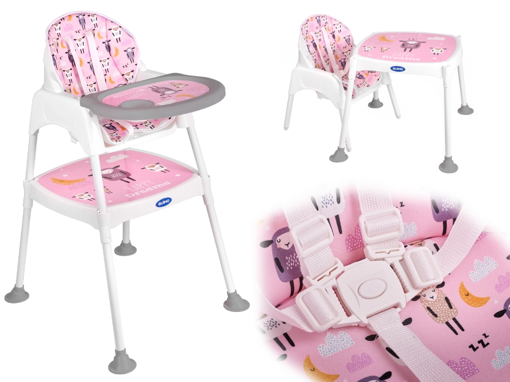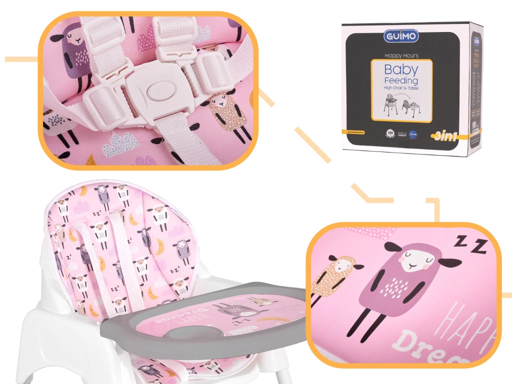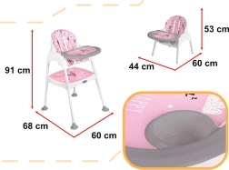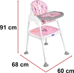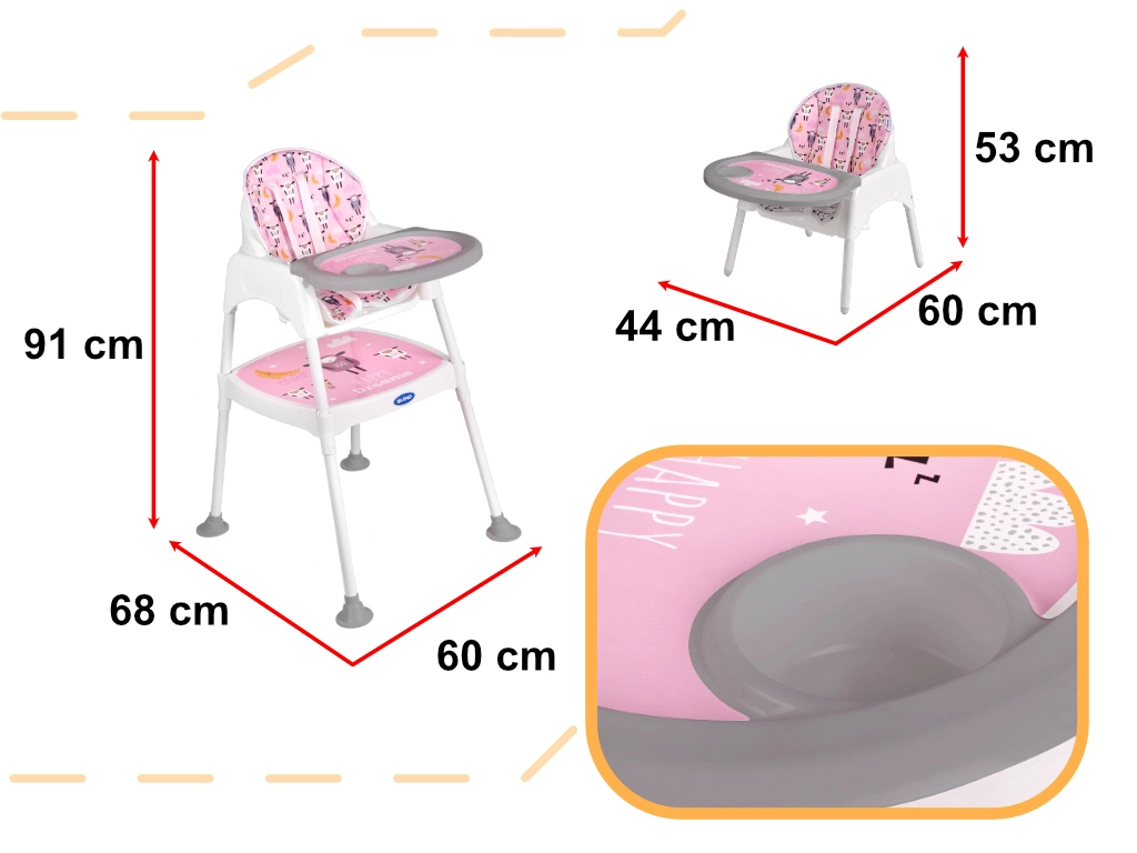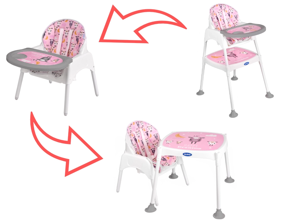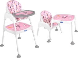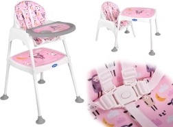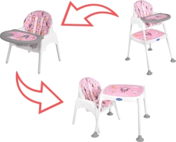 Stolička má tri rôzne funkcie! Môže sa používať ako stolička na kŕmenie pre deti od 6 do 36 mesiacov, a keď je vaše dieťa príliš veľké, môžete ju premeniť na stoličku a stolík. Táto kombinácia vám poskytne nielen pohodlné stolovanie, ale aj skvelé miesto na kreslenie a hranie. V tejto podobe ju môžete bez problémov používať až do šiestich rokov! Na montáž a demontáž stoličky nepotrebujete žiadne špeciálne zručnosti. Jednotlivé komponenty sa dajú zostaviť a rozložiť pomocou špeciálnych tlačidiel. Výrobok vám určite vydrží mnoho rokov vďakapevnej konštrukcii, ktorá rastie spolu s vaším dieťaťom!