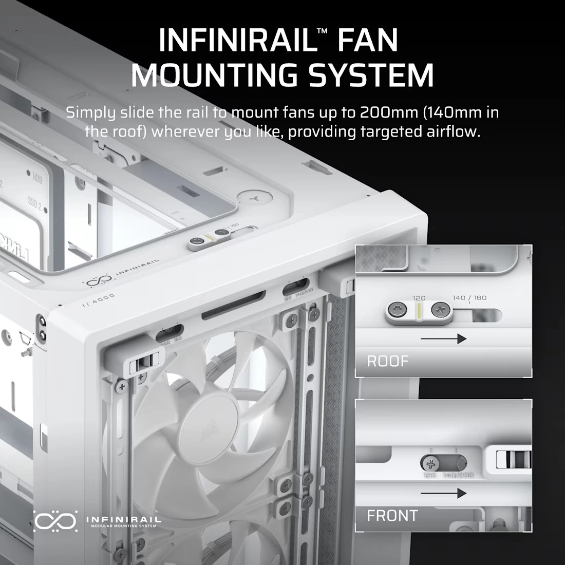 Táto skriňa prináša plne modulárnu konštrukciu, ktorá ešte viac uľahčuje personalizáciu vášho počítača podľa vlastných potrieb. Vďaka systému montáže ventilátorov InfiniRail je konštrukcia a údržba skrine jednoduchá a efektívna.