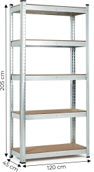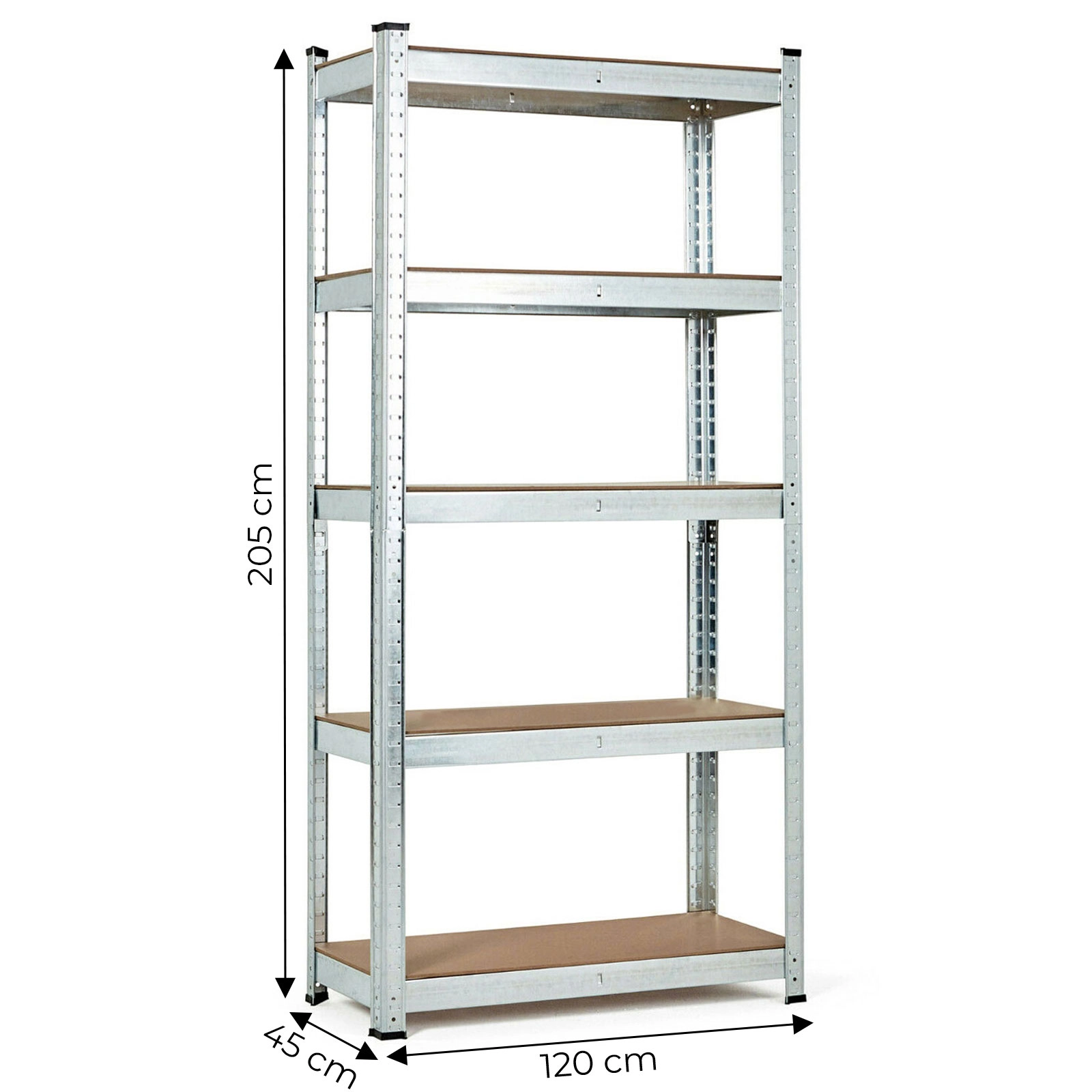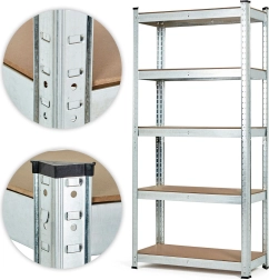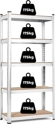 Regál obsahuje 5 odolných políc, ktoré možno namontovať v ľubovoľnej výške, aby vyhoveli vašim potrebám. Každá police podopiera až 175 kg, s celkovou nosnosťou 875 kg. Stabilitu zaisťujú dva dodatočné stredové podpery pod každou poličkou. Police sú vyrobené z odolného MDF, sú odolné proti poškodeniu a opotrebovaniu, čo zaisťuje dlhodobé používanie.