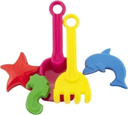 Lopatka, hrabličky a tri formičky ponúkajú deťom nekonečné možnosti tvorenia báboviek a pieskových stavieb.