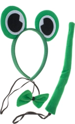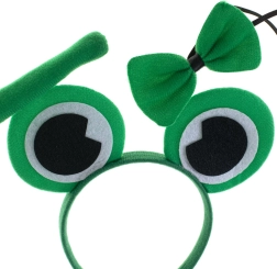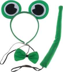Roztomilá sada pre malé žabky obsahuje zelenú čelenku s výraznými očkami, ladiaci motýlik a chvostík. Ideálna na karneval, maškarný bál, Halloween aj domáce hranie. Mäkké materiály, univerzálna veľkosť a pevne vystužené oči zaistia pohodlie aj skvelý vzhľad po celý deň.