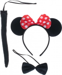 Táto kompletná kostýmová sada myšky je ideálna na karneval, Halloween, školské besiedky aj domáce hranie. K ikonickým ušiam s červenou bodkovanou mašľou ladí čierny motýlik a chvostík, takže prevlek je hotový behom pár sekúnd.