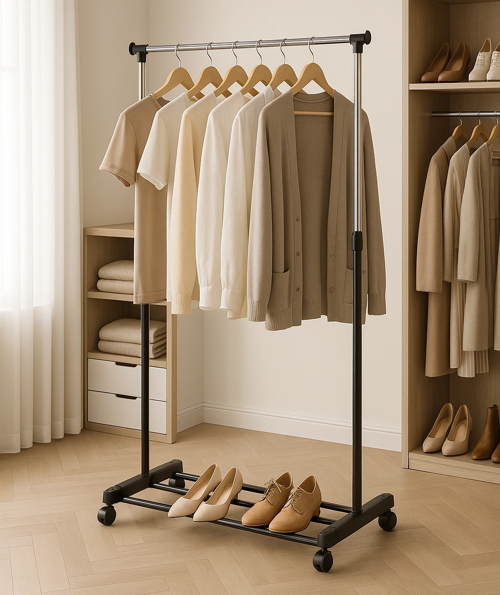 Voľne stojaci šatníkový vešiak je praktický spôsob, ako uskladňovať oblečenie a topánky, čo z neho robí skvelý doplnok pre každú šatňu, spálňu alebo chodbu vo vašom dome alebo byte. Vďaka univerzálnemu dizajnu ladí s modernými aj klasickými interiérmi, takže nielenže poskytuje funkčnosť, ale aj esteticky doplní váš interiér.