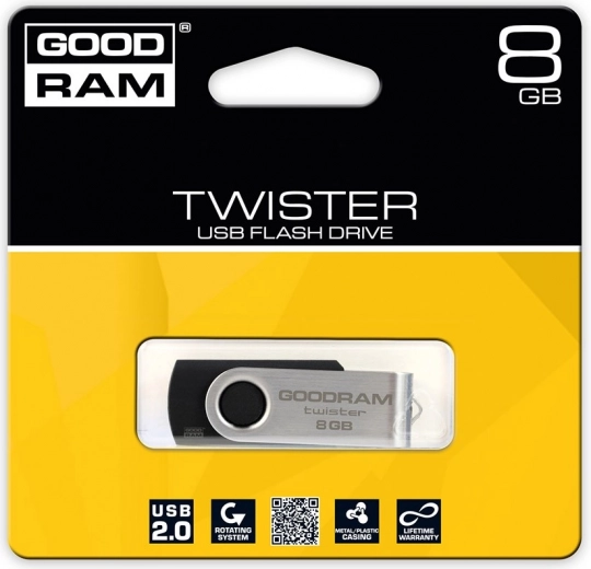 USB flash disk Goodram Twister 8GB kombinuje praktický dizajn a odolnosť. Otočný kovový kryt chráni USB konektor pred poškodením a znečistením, čo zaručuje dlhú životnosť disku. S rýchlosťou čítania až 20 MB/s a zápisu až 5 MB/s poskytuje efektívny výkon pre prácu s dátami.