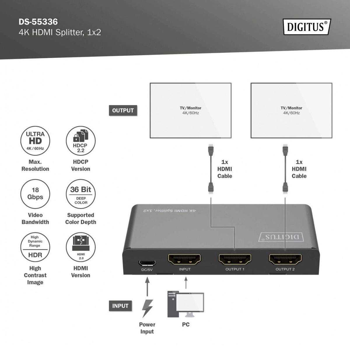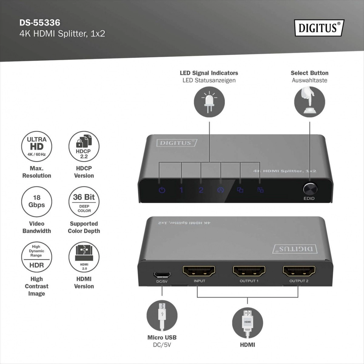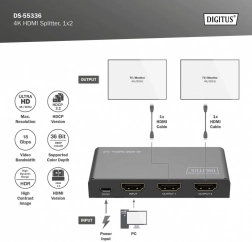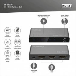 HDMI rozbočovač DIGITUS rozdeľuje alebo duplikuje signály audio a video z HDMI zariadenia na dva výstupy, čo umožňuje zobrazenie na viacerých displejoch súčasne. Vďaka funkcii downscaling podporuje zobrazenie 4K na Full HD displejoch, čo umožňuje súbežné použitie 4K aj Full HD displejov.