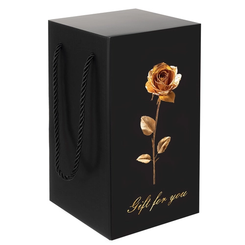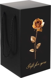 Elegantné darčekové balenie: Ruža je starostlivo zabalená v čiernom darčekovom boxe s dizajnom zlatej ruže, ktorý je pripravený na každú príležitosť. Box je vybavený pohodlnými čiernymi šnúrkovými držadlami.