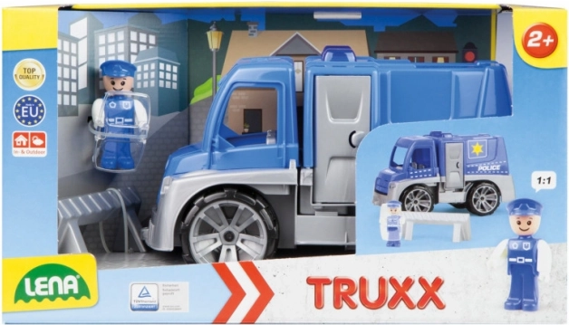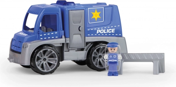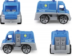 Robustné policajné auto z kvalitného plastu pre deti od 2 rokov. Ponúka mechanické funkcie bez batérií, otváracie dvere, vyklápateľnú kabínu a figúrku policajta so štítom pre kreatívnu hru doma aj v piesku.