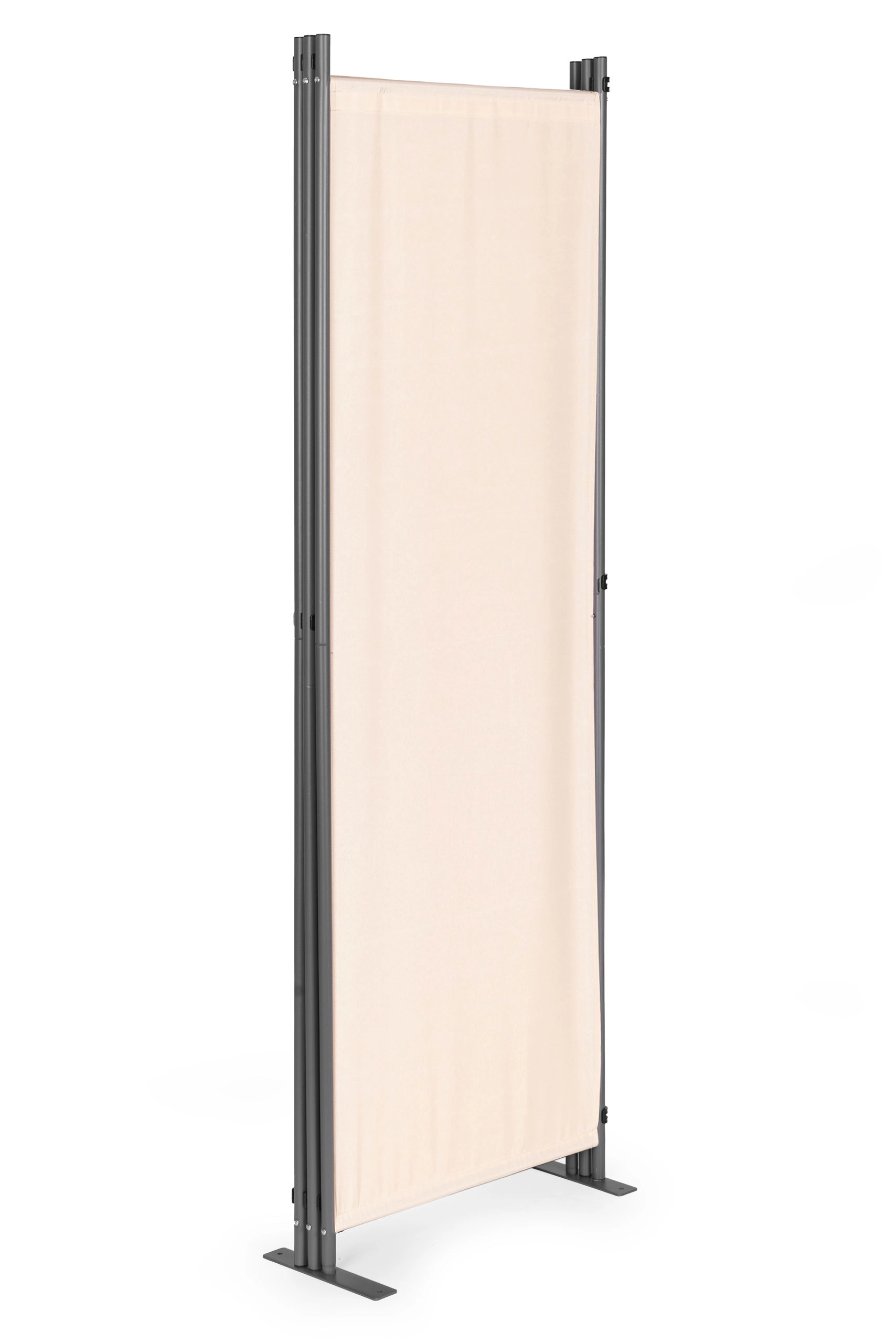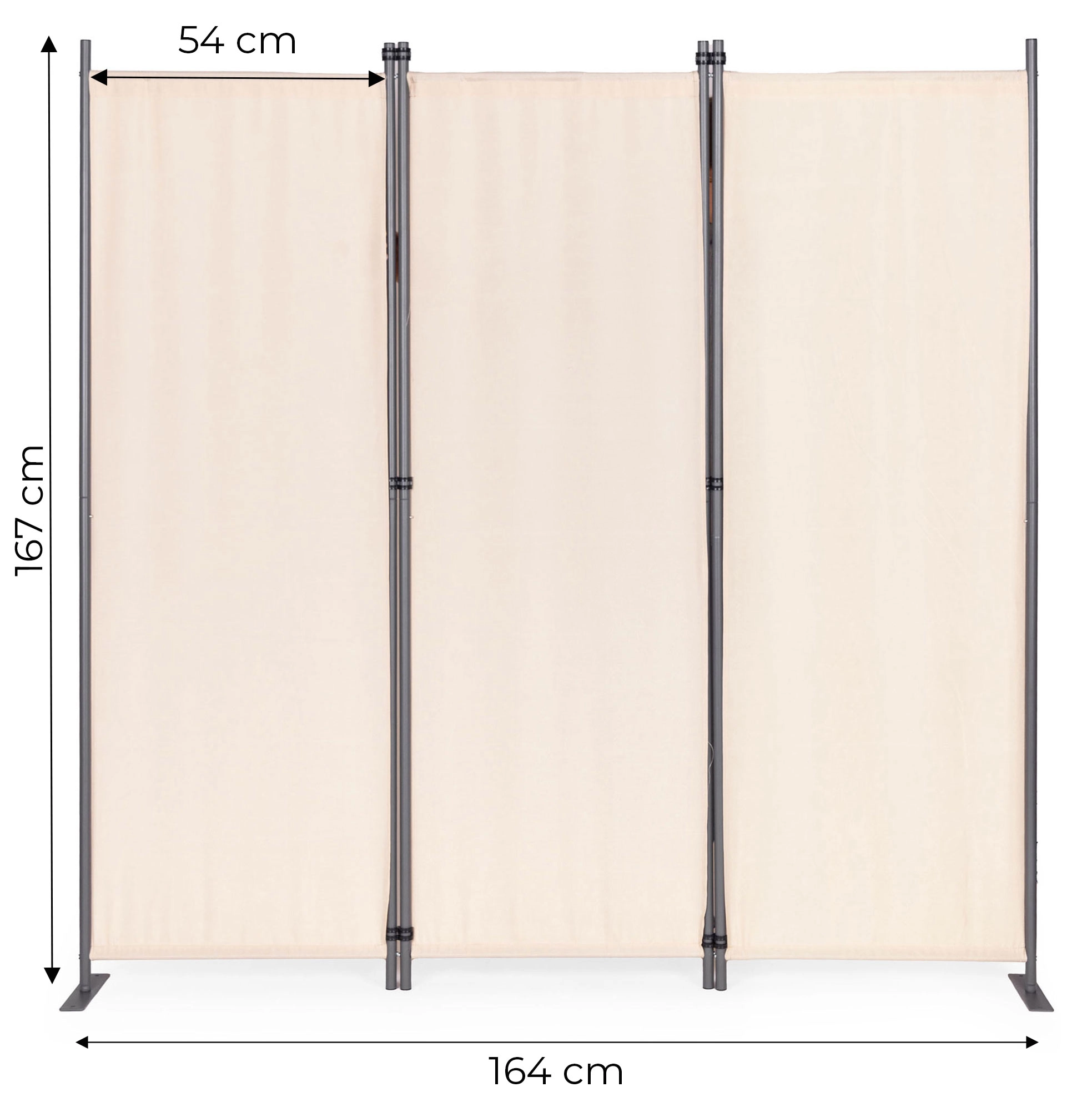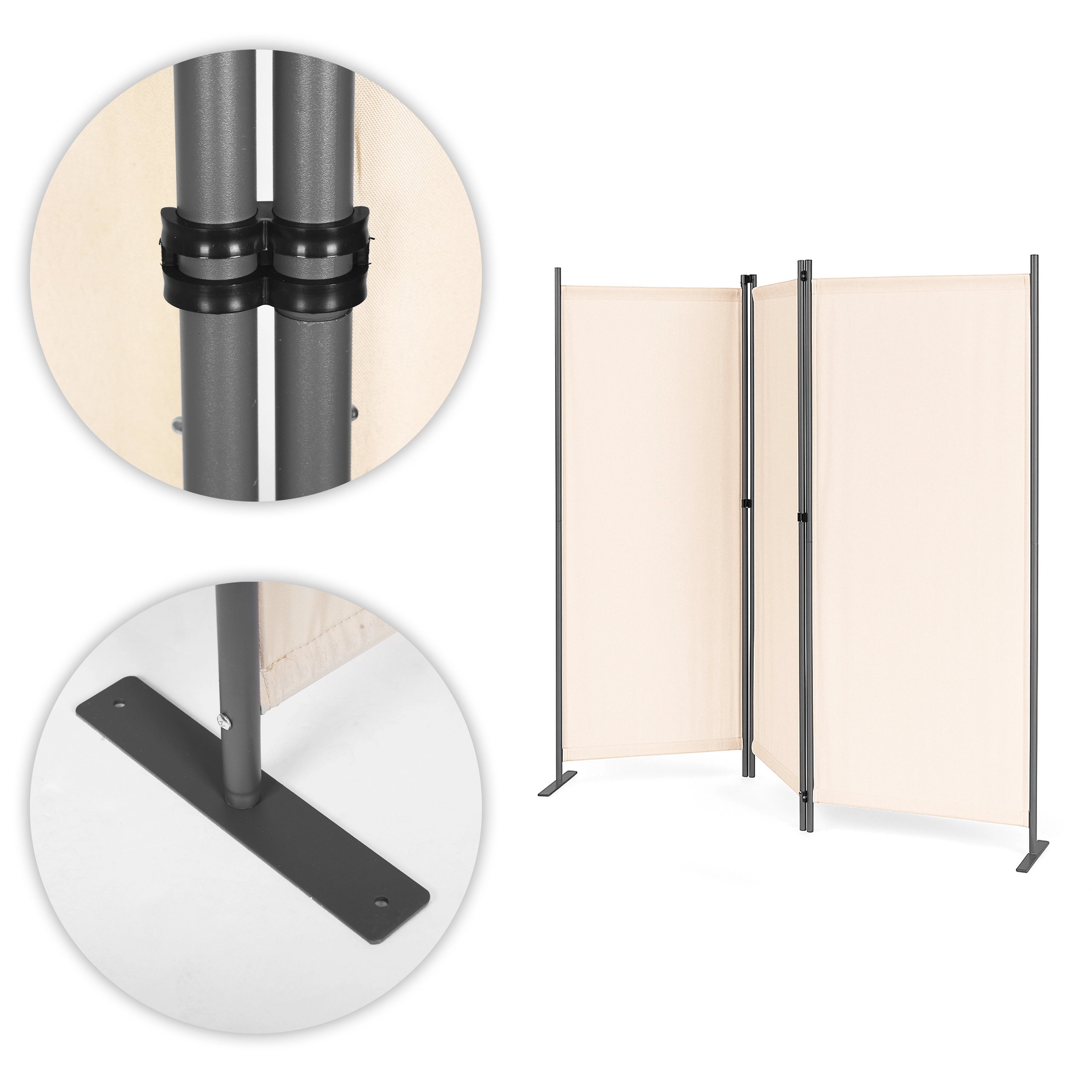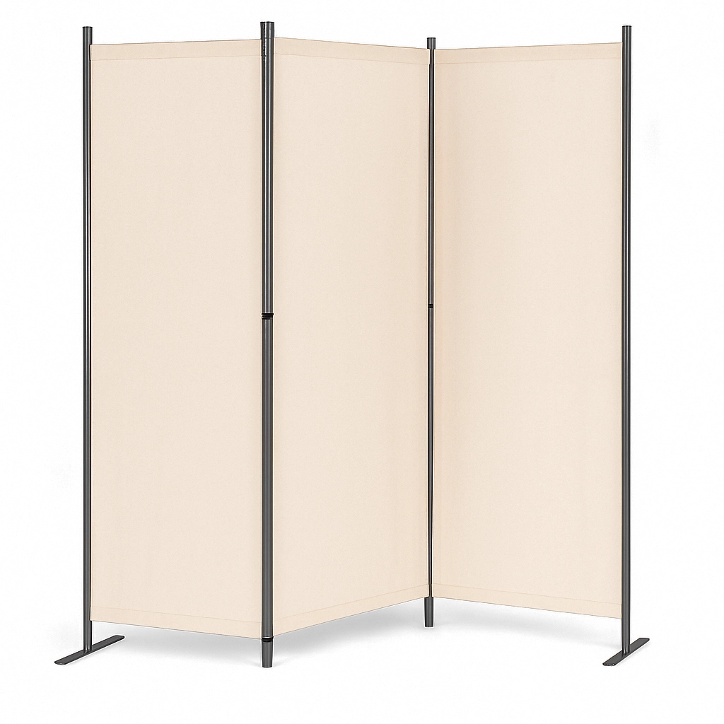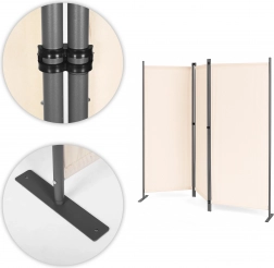 Pevné spojky panelov umožňujú jednoduché skladanie a rozkladanie zásteny. Stabilná kovová základňa má praktické montážne otvory na dodatočné upevnenie zásteny k zemi. Vďaka širokej podpore je rozloženie váhy rovnomerné a zabraňuje prevráteniu, aj na nerovnom povrchu. Príslušenstvo pre montáž zvyšuje stabilitu a bezpečnosť užívateľov tým, že zástena zostáva stabilná aj vo veterných podmienkach.