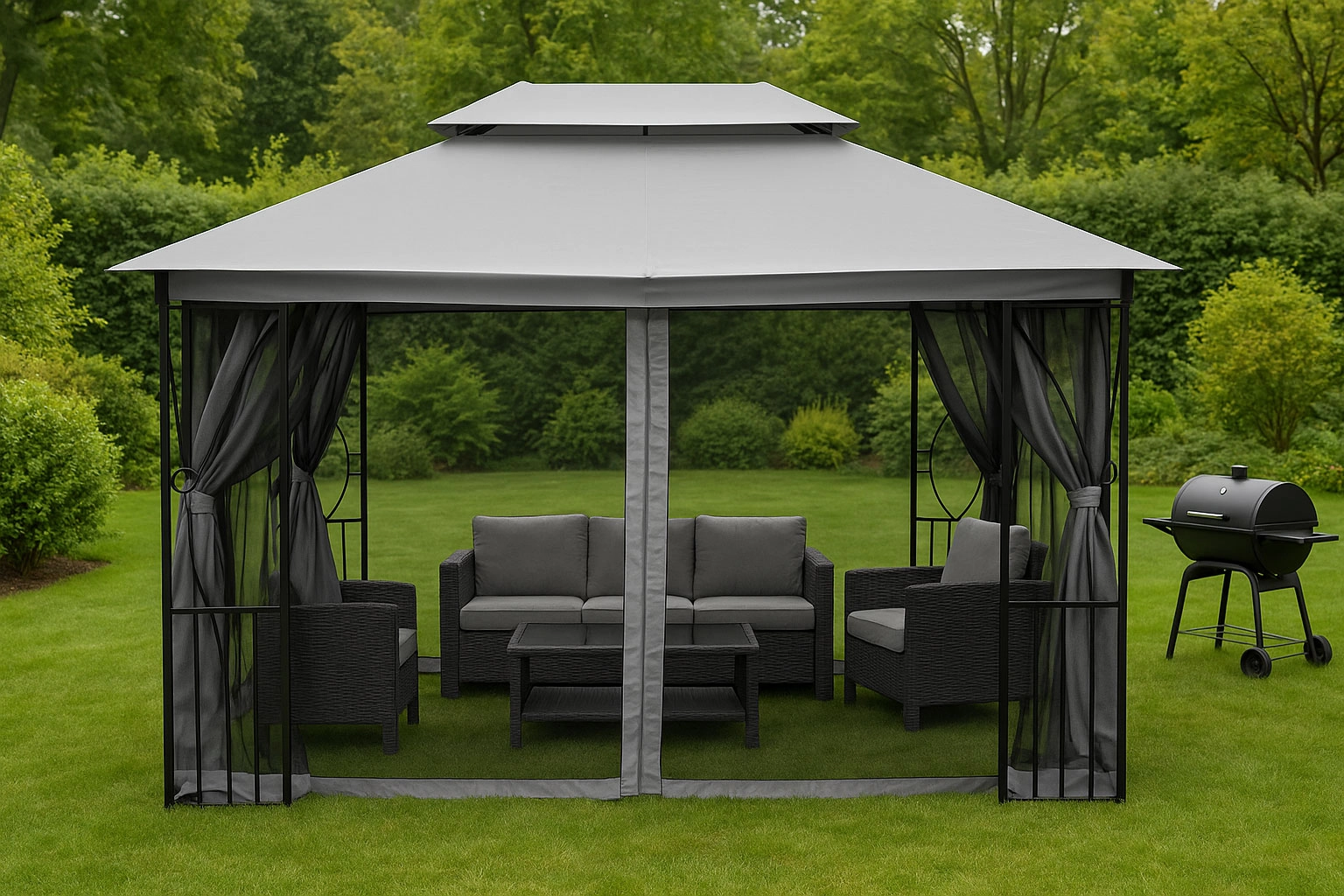 Dvojitá strecha: Špeciálny ventilačný otvor na vrchole strechy výrazne zlepšuje prúdenie vzduchu vo vnútri altánu, pomáha znižovať nárast tepla počas horúcich dní a zabraňuje hromadeniu vlhkosti. Otvor tiež pomáha zmierňovať tlak vetra pri silných poryvoch.