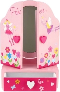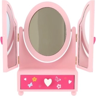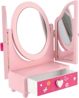 Roztomilé detské toaletné zrkadlo so šperkovnicou v motíve PRINCESS poteší každú malú parádnicu. Trojkrídlové zrkadlo s bočnými dielmi pre lepší náhľad, praktická zásuvka na poklady a pevné drevené spracovanie v jemnej ružovej farbe. Ideálne na ukladanie prstienkov, náramkov a korálikov a na podporu kreatívnej hry.
