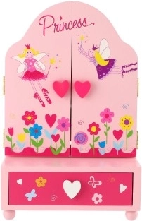 Drevená toaletka so šperkovnicou Princess je skvelým doplnkom do detskej izby. Stredové oválne zrkadlo dopĺňajú dve postranné krídla pre pohodlné nastavenie uhla. V spodnej časti nájdete praktickú zásuvku, kam si deti uložia svoje malé poklady. Jemné zdobenie s motívmi víl, kvetín a srdiečok podporuje fantáziu a radosť z hry.