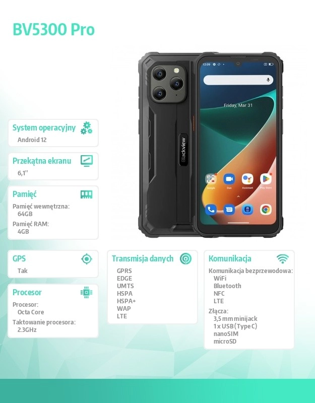 Blackview BV5300 Pro vyniká svojím 6,1" IPS displejom, ktorý ponúka jasný a ostrý obraz vďaka rozlíšeniu 1560 x 720 pixelov. Výkonný osemjadrový procesor MediaTek Helio P35 dosahuje takt až 2,3 GHz, čo zaisťuje rýchly a plynulý chod systému, podporený 4 GB RAM a 64 GB internou pamäťou. Pamäť možno rozšíriť pomocou microSD karty až o 512 GB, čo poskytuje dostatok priestoru pre všetky vaše potreby.