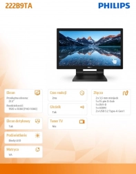 Monitor Philips s uhlopriečkou 21,5 palcov je vybavený technológiou dotykového ovládania, ktorá umožňuje 10-bodový multitouch, čo je ideálne pre použitie v interaktívnych aplikáciách. Vďaka použitému VA panelu ponúka monitor ostré detaily a široké pozorovacie uhly, čo zaisťuje skvelý zážitok z každého pohľadu.