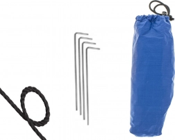 V balení nájdete prepravný vak, kolíky a šnúry na zaistenie vo vetre. Montáž s klasickým hrotom je rýchla a spoľahlivá.