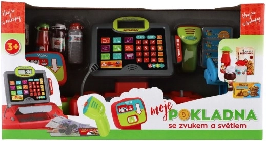Veľká detská pokladňa premení každý kút na malý obchod. Ponúka svetelné a zvukové efekty, funkčnú kalkulačku, čítačku kariet a váhu na ovocie a zeleninu. Súčasťou sú makety bankoviek, mincí a potravín. Napájanie 2× AA (nie sú súčasťou). Vhodné od 3 rokov.