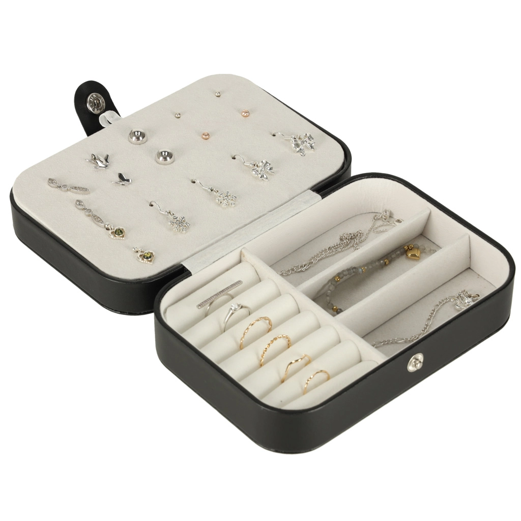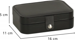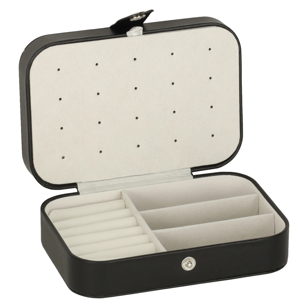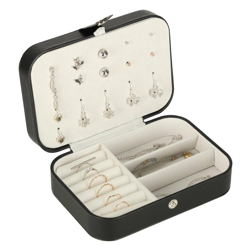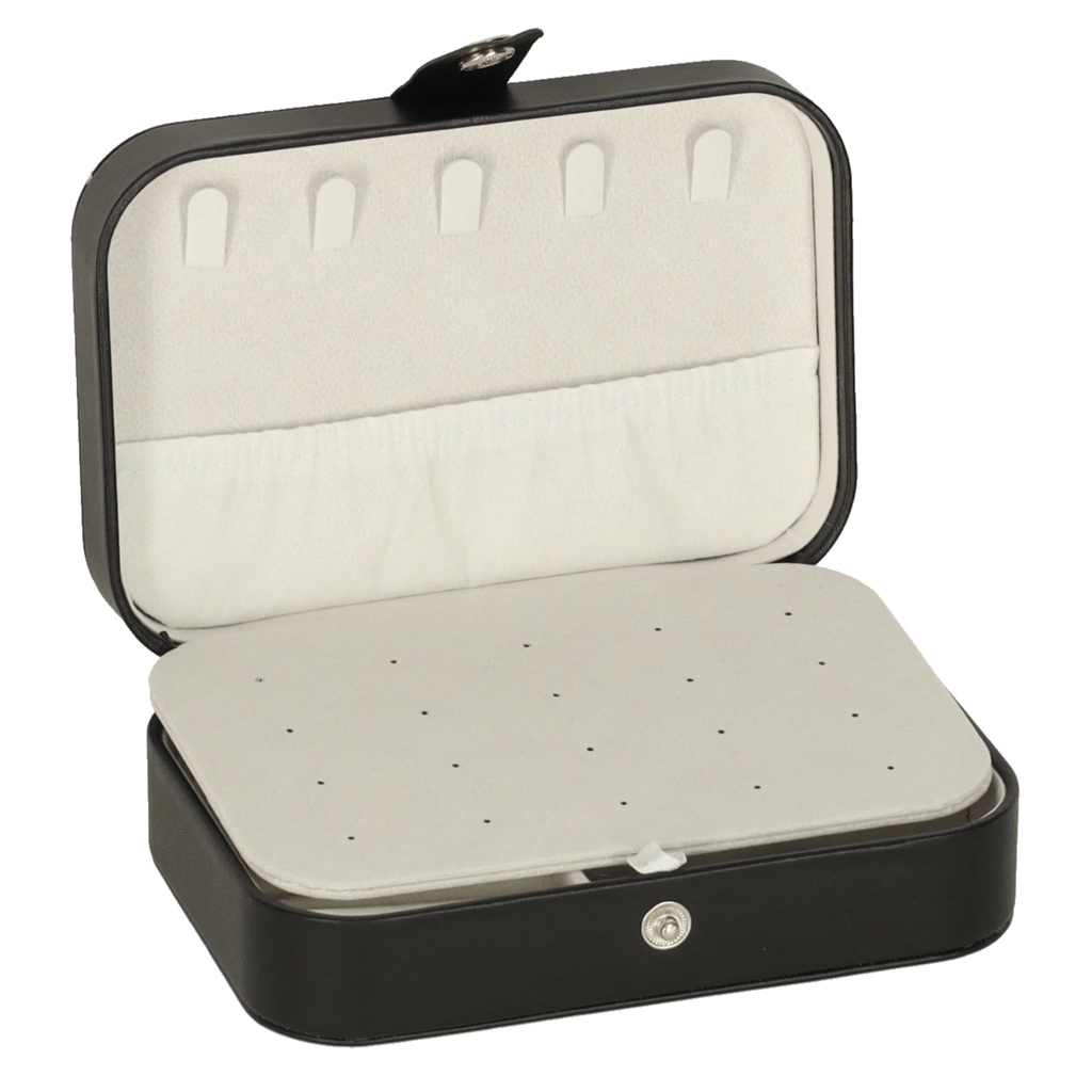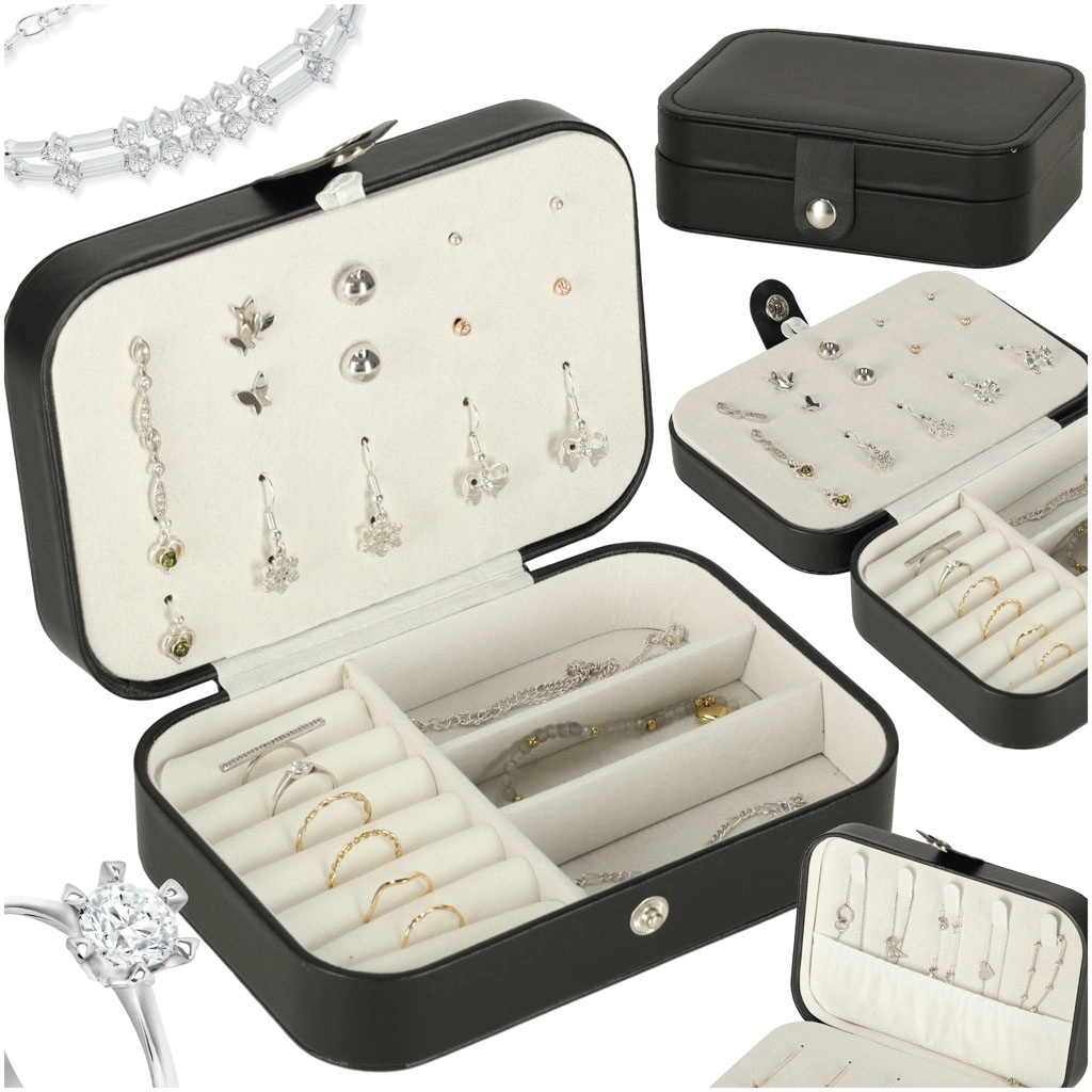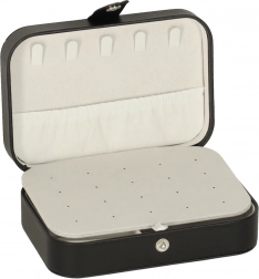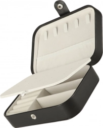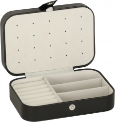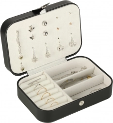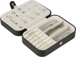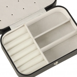 Táto štýlová šperkovnica v klasickej čiernej s kontrastným svetlým interiérom kombinuje moderný dizajn a praktickú funkčnosť. Mäkké polstrovanie spoľahlivo chráni jemné povrchy šperkov a premyslené rozvrhnutie udrží všetky doplnky prehľadne na svojom mieste. Ideálna do kabelky, kufra aj na toaletný stolík.