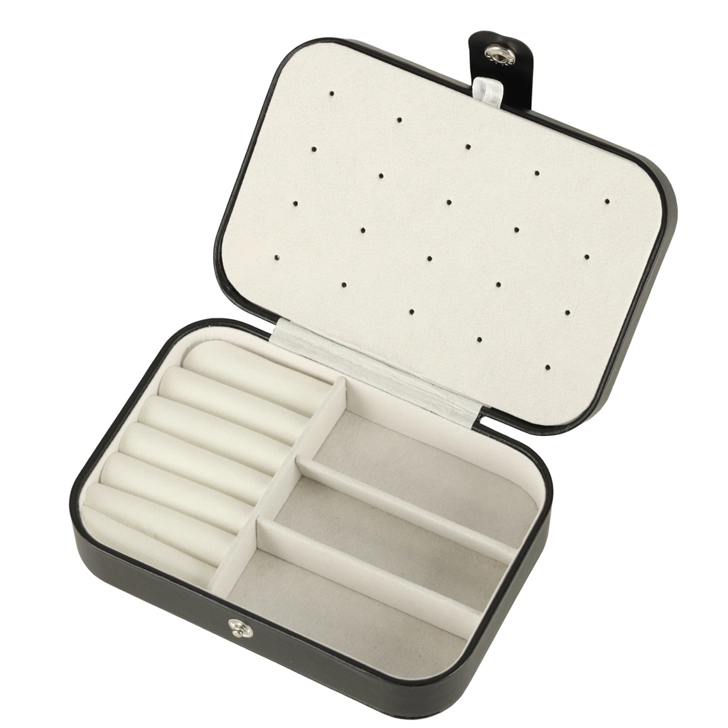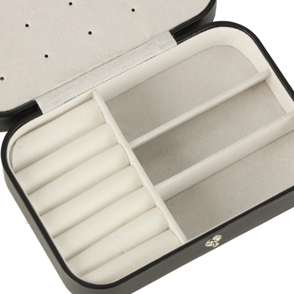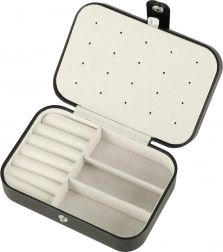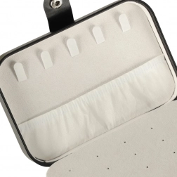 Elegantná cestovná šperkovnica s premysleným členením pre prstene, náušnice, náramky a náhrdelníky. Kompaktné rozmery, bezpečné zapínanie na patent a mäkké polstrovanie chránia šperky doma aj na cestách. Ponúka 12 miest na prstene, panel pre 10 párov náušníc, priehradky na drobnosti a 5 háčikov s vreckom na retiazky.
