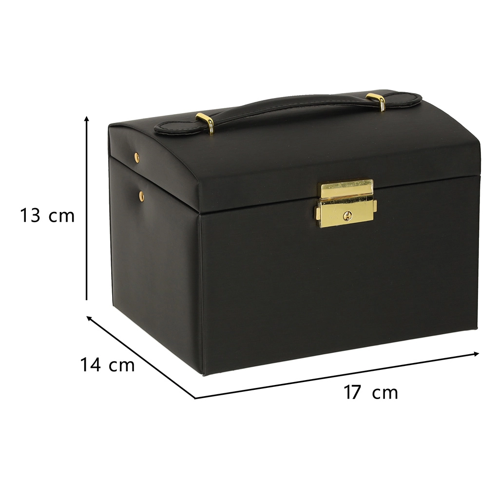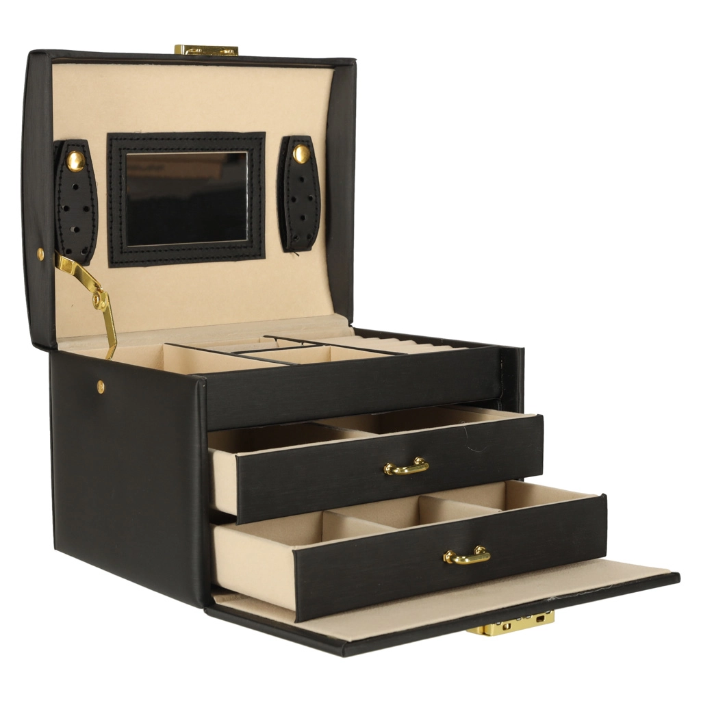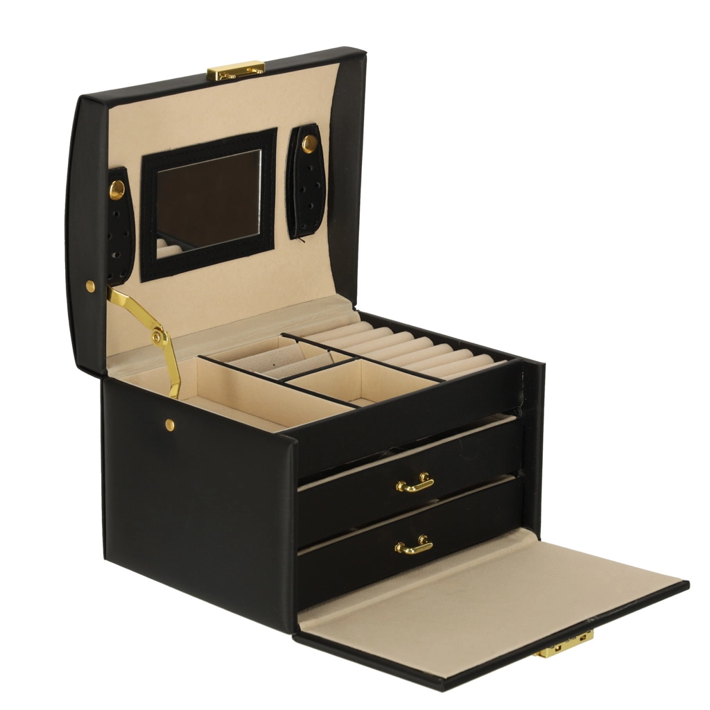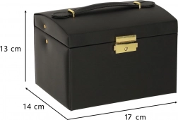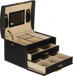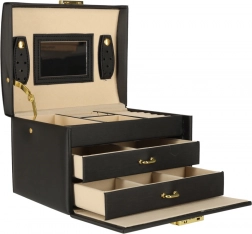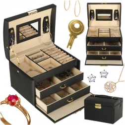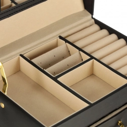 Elegantná čierna šperkovnica so zrkadielkom a zásuvkami na prehľadné ukladanie prsteňov, náušníc, náramkov a náhrdelníkov. Ponúka priestranné priehradky, dve zásuvky, mäkkú podšívku proti poškodeniu a zamkýnanie na kľúčik pre vyššiu bezpečnosť. Ideálne riešenie na organizované ukladanie bižutérie doma aj na cesty.