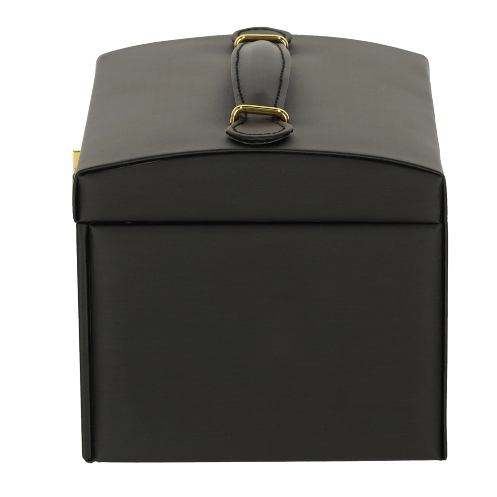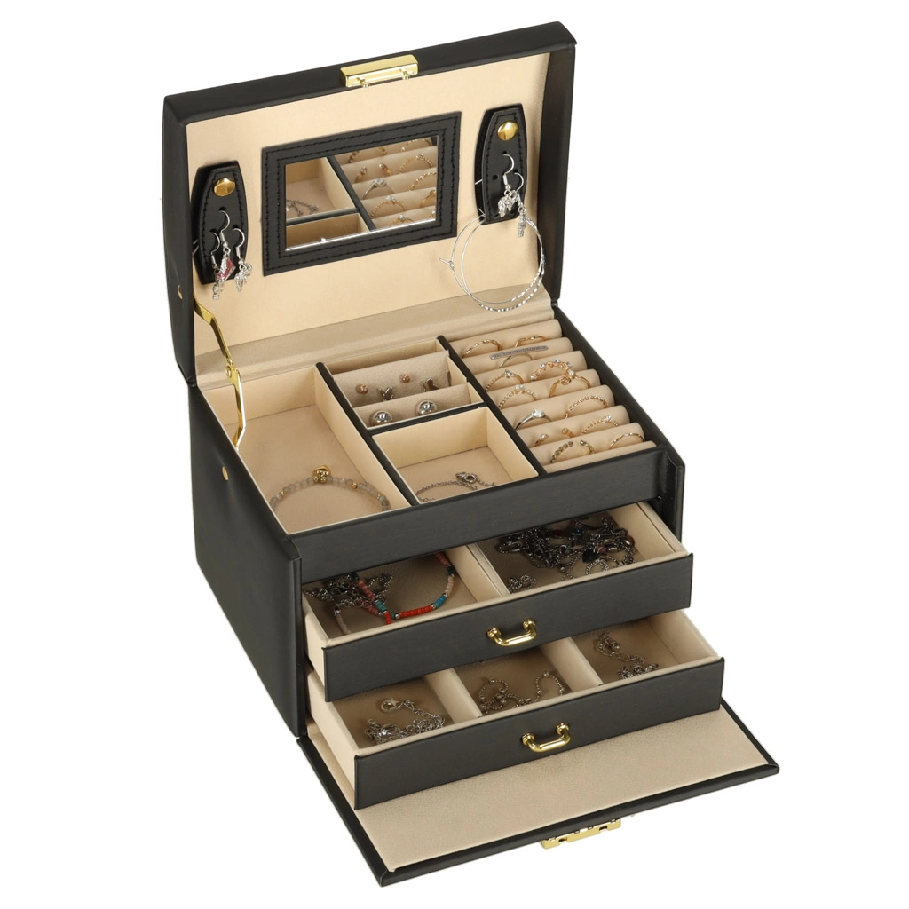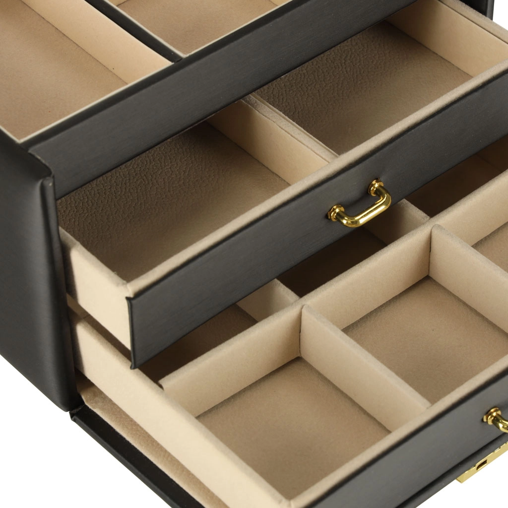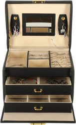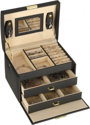 Elegantná čierna šperkovnica so zrkadielkom a zásuvkami na prehľadné ukladanie prsteňov, náušníc, náramkov a náhrdelníkov. Ponúka priestranné priehradky, dve zásuvky, mäkkú podšívku proti poškodeniu a zamkýnanie na kľúčik pre vyššiu bezpečnosť. Ideálne riešenie na organizované ukladanie bižutérie doma aj na cesty.