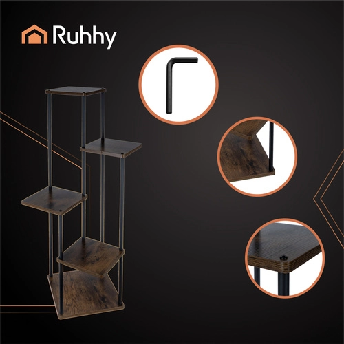 Kvetinový stojan RUHHY prináša funkčnosť a štýl do vašej domácnosti. Vďaka svojim 5 úrovňovým konštrukciám môžete vyčleniť priestor pre rastliny na malej ploche so moderným dizajnom, ktorý zahŕňa kovovú konštrukciu a drevené police. Solídny kovový rám unesie až 75 kg hmotnosti, čo zaručuje stabilitu a odolnosť stojanu. Pre ochranu podlahy je vybavený ochrannými nožičkami, ktoré zabraňujú poškrabaniu a umožňujú vyrovnanie stojanu.