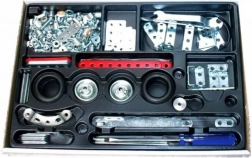 Stavebnica obsahuje 230 kovových dielov vrátane skrutiek, matiek a ďalších komponentov usporiadaných v čiernej priehradke.