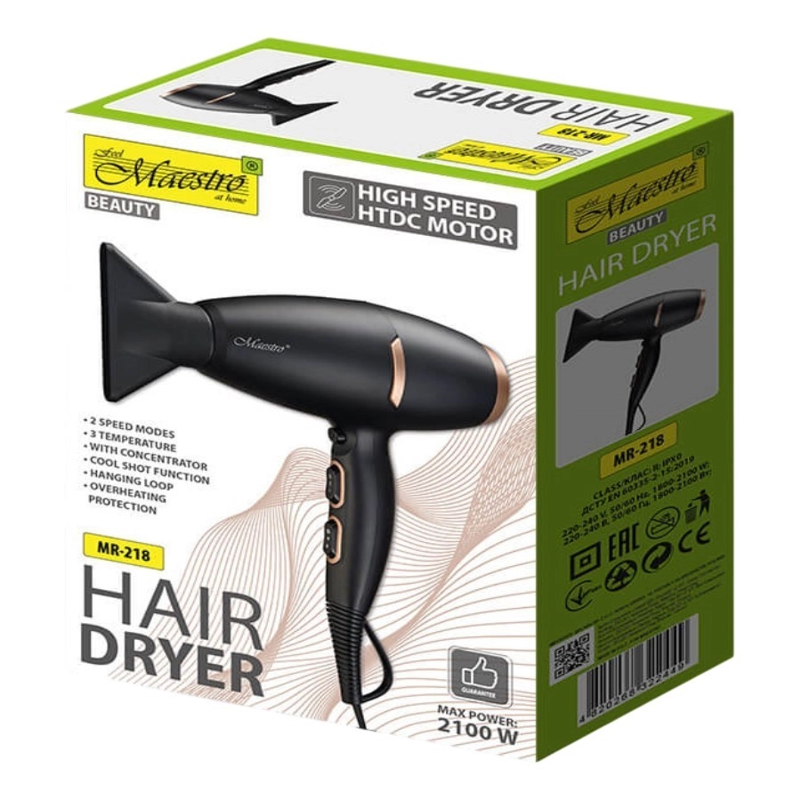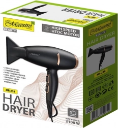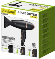 Sušič vlasov Maestro je vybavený dvoma koncentrátormi pre presný styling a zameranie prúdu vzduchu tam, kde je najviac potrebné. Ponúka dve rýchlosti fúkania a tri teplotné nastavenia, čo umožňuje prispôsobenie fungovania podľa individuálnych potrieb a typu vlasov.