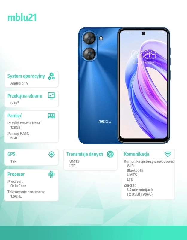 Hlavný 13MP fotoaparát s päťčlenným objektívom zachytí každý detail, zatiaľ čo 8MP predná kamera je vaším partnerom pre selfie a videohovory. MEIZU je vybavený najnovším operačným systémom Android 14 a širokými možnosťami konektivity vrátane Wi-Fi, Bluetooth 5.0 a USB Type-C.