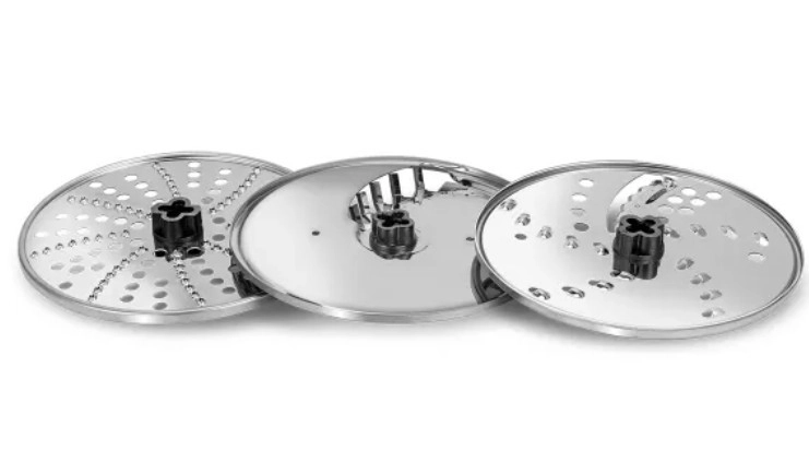 Súčasťou balenia sú 3 nerezové disky. Disk na rozotieranie zemiakov uľahčuje prípravu chrumkavých placiek, disk na strúhanie a krájanie na plátky je ideálny pre zeleninu a syry, zatiaľ čo disk na krájanie na tyčky umožňuje rýchle vytváranie tvarovaných hranolčekov alebo príloh do šalátov.