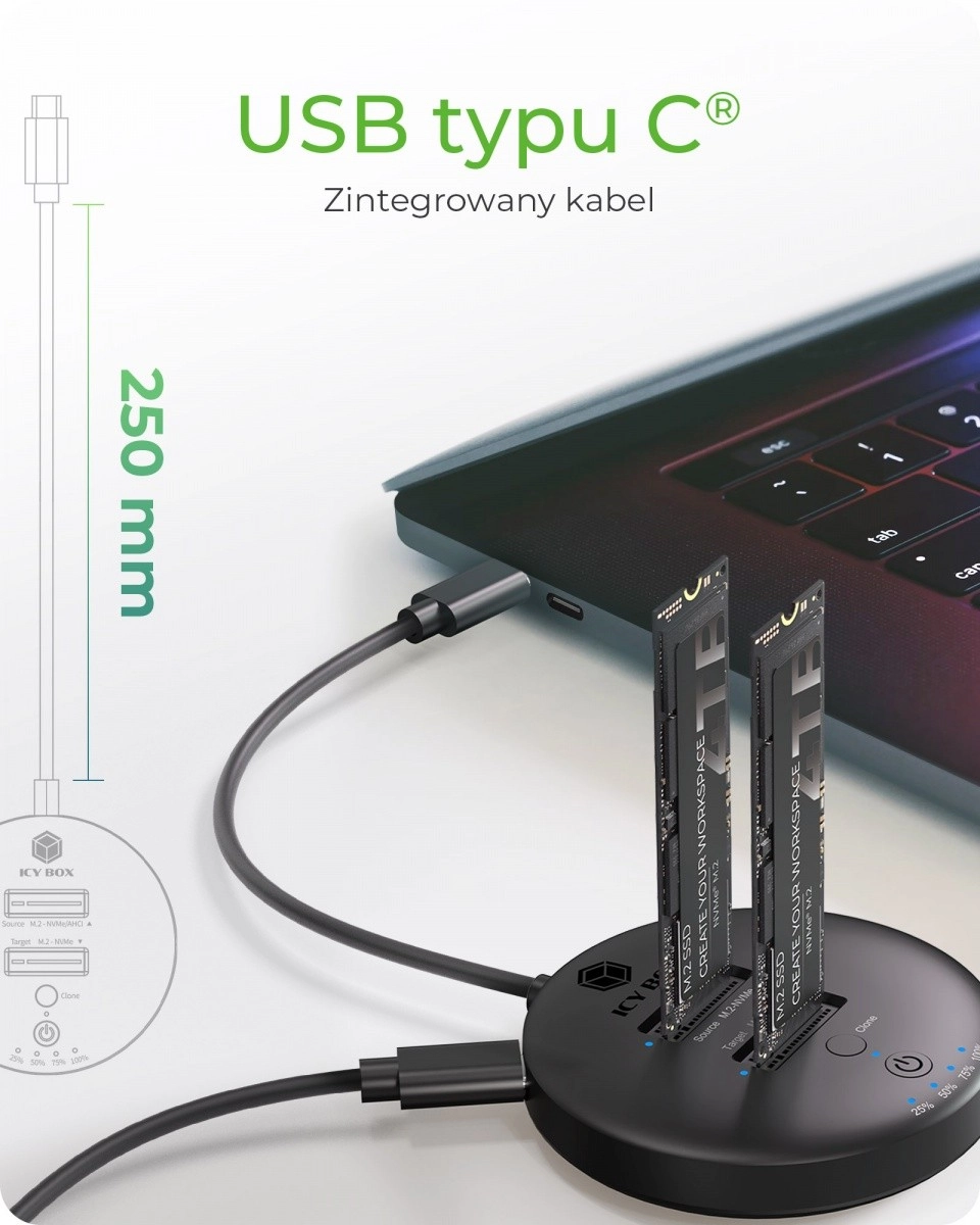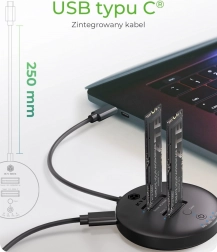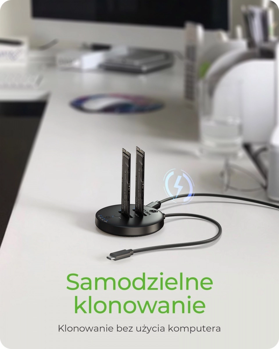Táto stanica funguje ako dokovacia stanica pre dva M.2 NVMe SSD disky, keď je pripojená k počítaču pomocou integrovaného USB-C kábla. Poskytuje rýchly prenos dát medzi oboma diskami a podporuje vysoké rozlíšenie úložiska a zálohovanie systému v reálnom čase.
