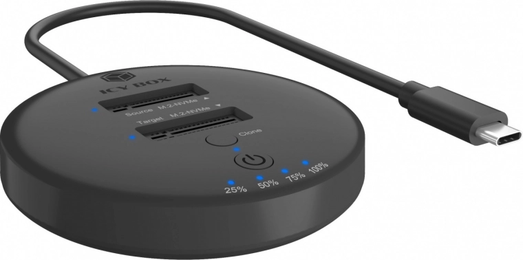 Stanica IB-1612MCL-C31 vám umožňuje samostatné klonovanie diskov bez potreby pripojenia k počítaču. Jednoducho zduplikujete celý M.2 NVMe SSD disk pre rýchlu migráciu systému. LED indikátory jasne zobrazujú priebeh klonovania.