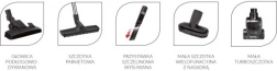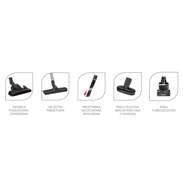 Vybavenie vysávača: V sade nájdete podlahovú a kobercovú hlavicu, parketový kefa, malú turbo kefa, vysúvateľnú štrbinovú trysku a malý multifunkčný kefa s nástavcom.