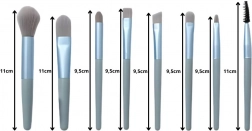 Každý štetec má premyslený tvar a veľkosť na konkrétnu úlohu: od nanášania a blendenia očných tieňov, cez korekciu, až po vytváranie presných liniek a úpravu obočia. Sada je dodávaná v mixe farieb (ružová, modrá, sivá) bez možnosti výberu.