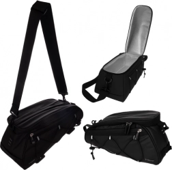 Bezpečné upevnenie k nosiču bicykla je zaistené pomocou suchého zipsu a karabín, čím vytvára stabilnú a spojenú konštrukciu. Dodatočné odrazové prvky zvyšujú viditeľnosť pri nočnej jazde, čo zaručuje vašu bezpečnosť.