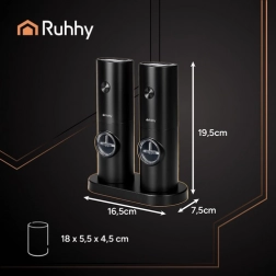 Elektrické mlynčeky na korenie a soľ značky RUHHY sú ideálnym doplnkom pre všetkých, ktorí si potrpia na kvalitu a estetiku. Univerzálne použitie umožňuje ich využitie pre rôzne typy korenín, vrátane byliniek. Mletie zabezpečuje keramický mechanizmus, ktorý je trvácny a precízny bez kovovej pachuti.