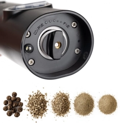 Vďaka LED osvetleniu máte kontrolu nad množstvom korenín aj pri tlmenom osvetlení. Priehľadné okienko vám vždy ukáže, koľko korenín zostáva. Mlynčeky sú poháňané batériou (4× AAA na jeden mlynček) a sú ľahko použiteľné jedným tlačidlom.