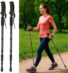 Ľahké a odolné skladacie trekingové palice vyrobené z hliníka, vhodné pre Nordic Walking. Jednoduché nastavenie dĺžky pomocou zámku a ergonomické rukoväte pre pohodlný úchop.