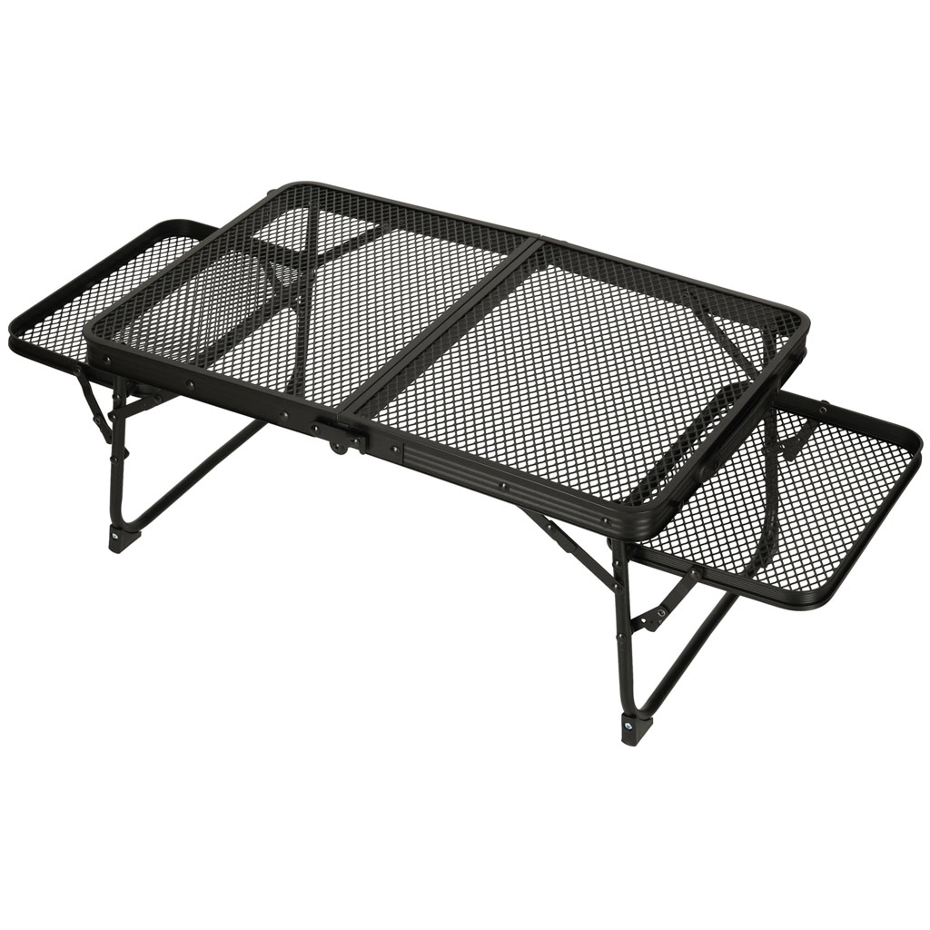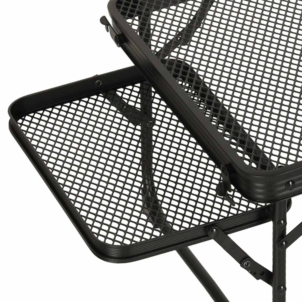 Hliníková konštrukcia s kovovou mriežkovanou doskou zaručuje ľahkosť, odolnosť a rezistenciu voči hrdzi. Stôl je navrhnutý na dlhodobé používanie aj v náročných vonkajších podmienkach.
