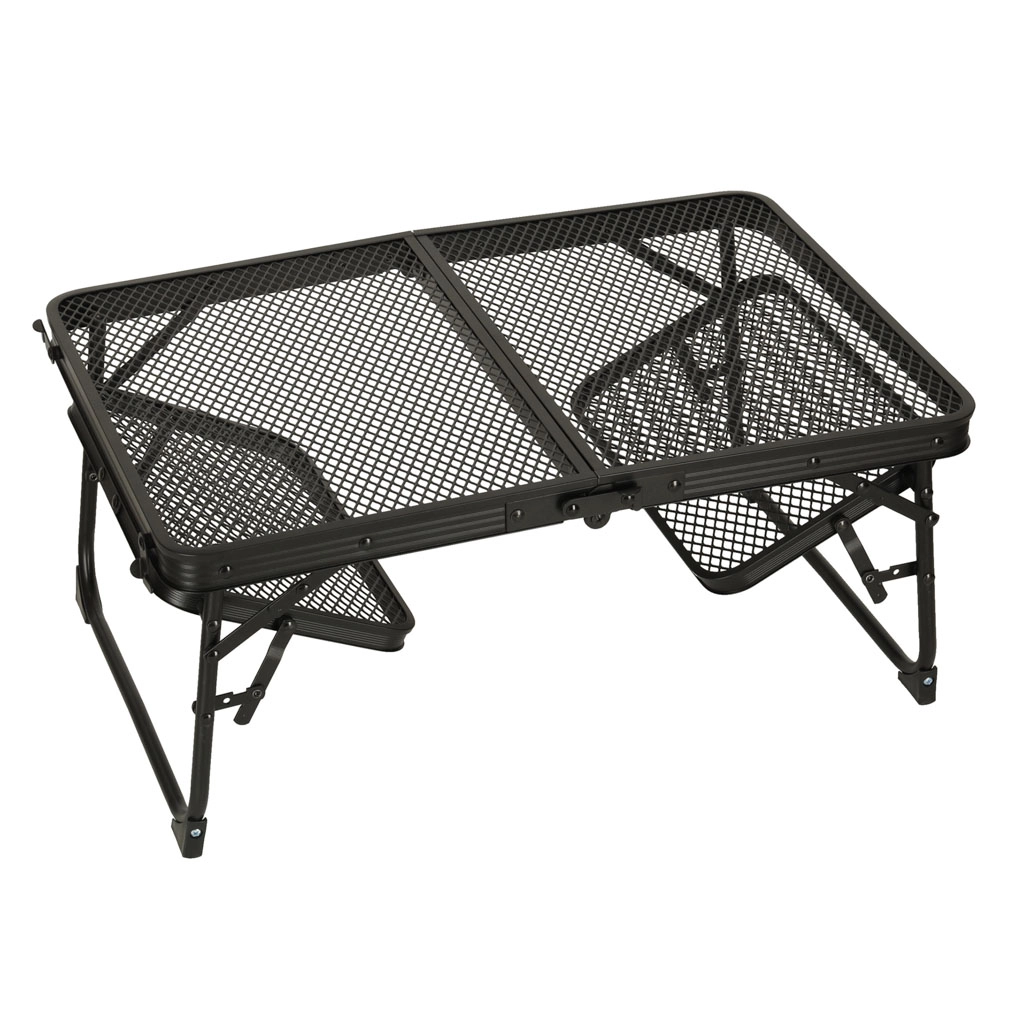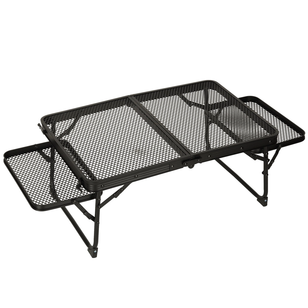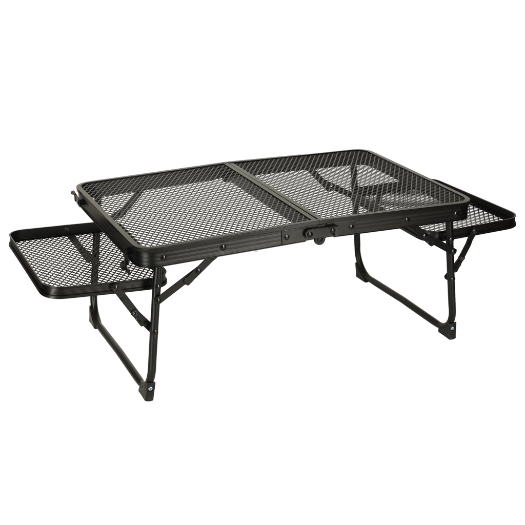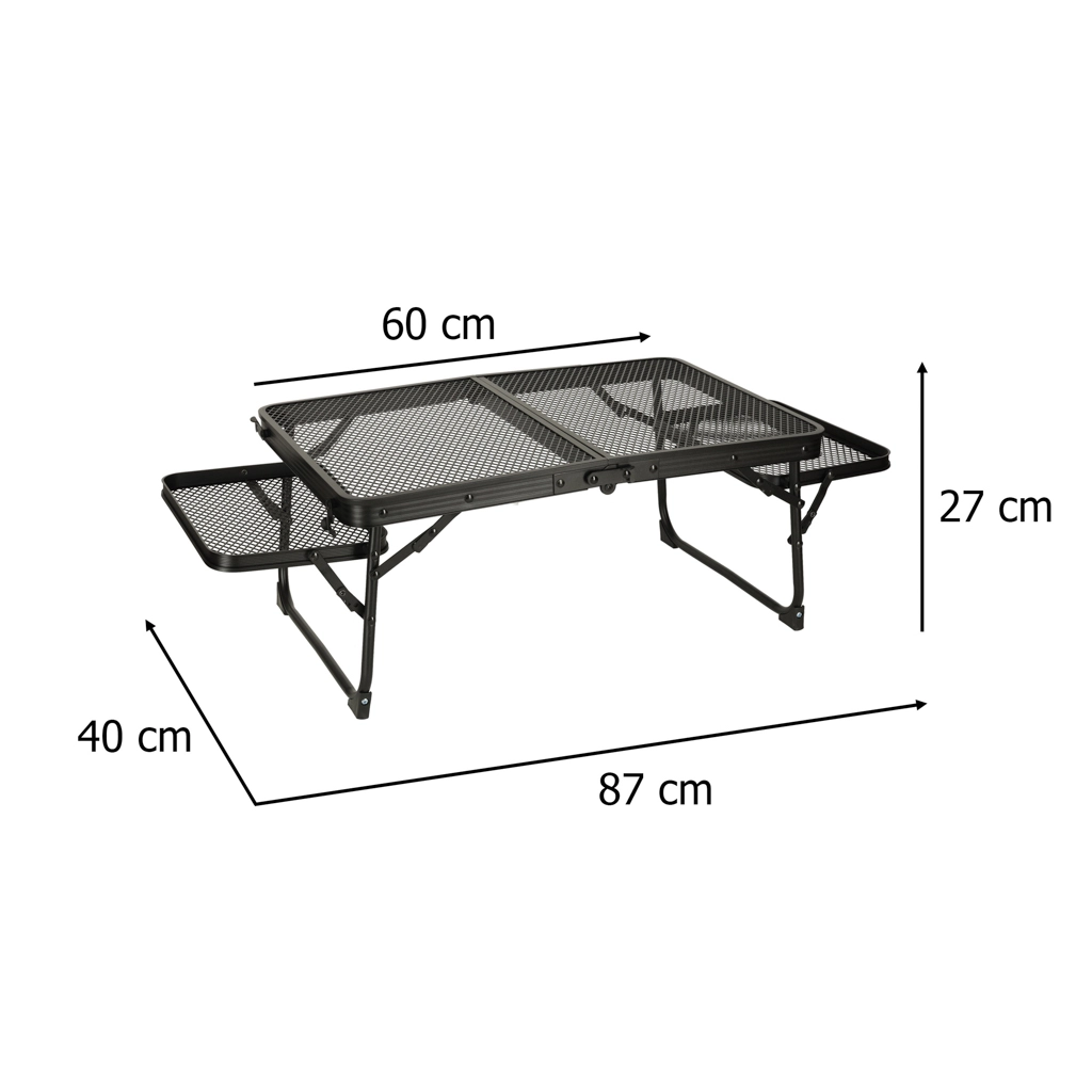 Tento skladací kempingový stôl je ideálny pre tých, ktorí hľadajú multifunkčné a praktické riešenie pre vonkajšie aktivity. Vyrobený z hliníkovej konštrukcie, stôl je odolný proti hrdzi a jeho kovová mriežkovaná doska poskytuje výbornú ventiláciu a odolnosť. Vďaka svojej nízkej hmotnosti ho môžete ľahko prenášať a skladovať, čo je perfektné pre použitie na kempingu, pikniku alebo aj na záhrade.