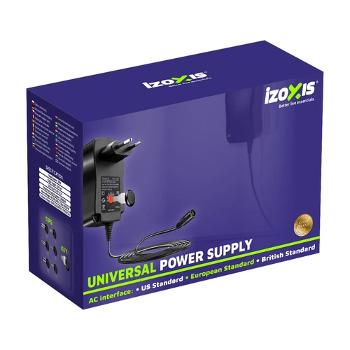 Univerzálny adaptér Izoxis je vybavený šiestimi vymeniteľnými koncovkami rôznych veľkostí a regulovateľným napätím, čo z neho robí perfektné riešenie pre väčšinu DC zariadení. Vďaka presnému nastaveniu napätia pomocou kľúča je použitie bezpečné a jednoduché.