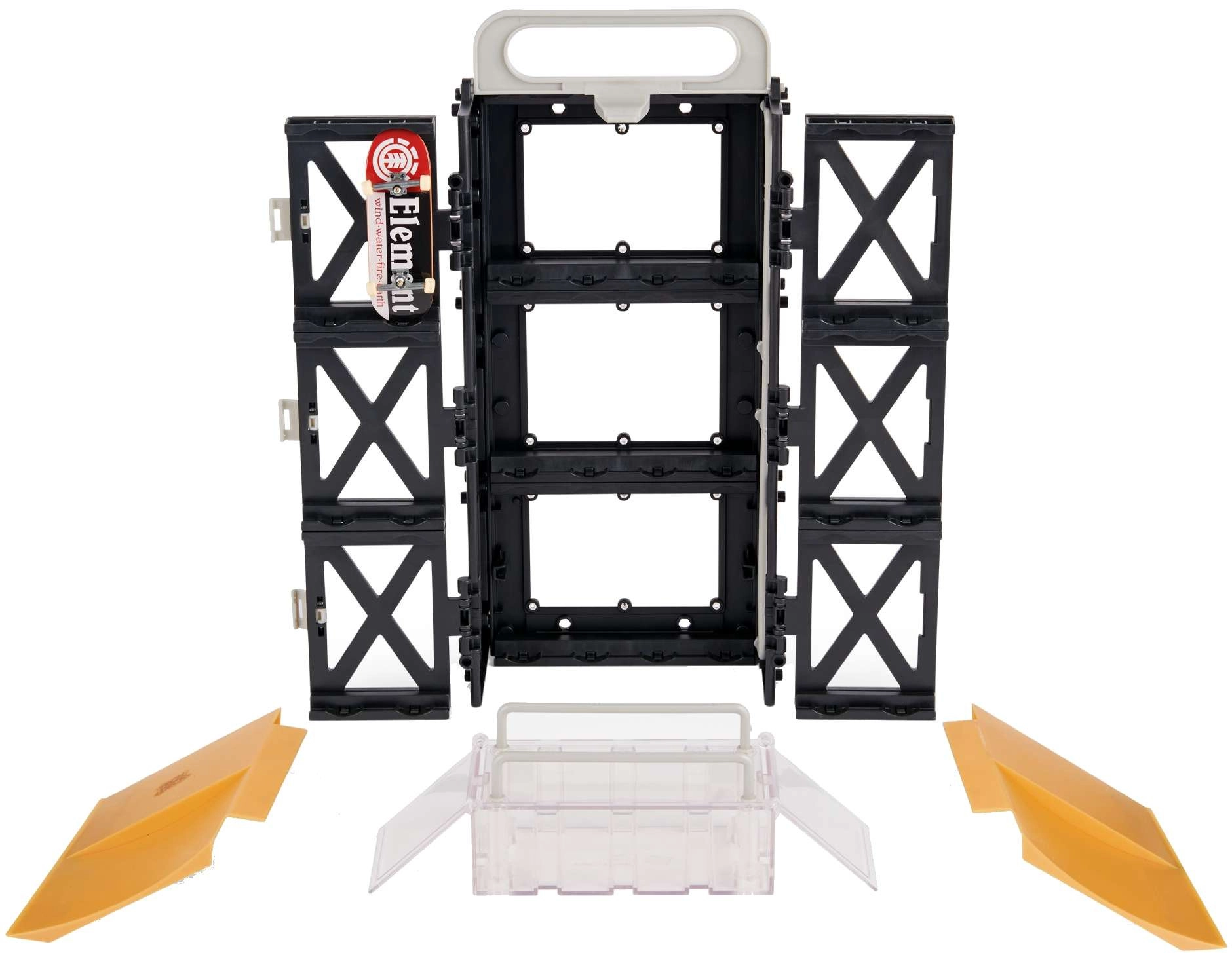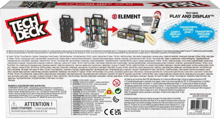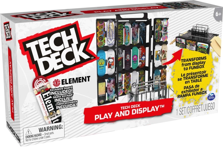 Tech Deck Play and Display je šikovné 2v1 riešenie: stojan a úložné puzdro pre vašu kolekciu aj kompletný fingerboard skatepark na triky. Crate konštrukcia sa ľahko rozkladá na funbox s rampami a grind railmi, takže môžete jazdiť doma aj na cestách. Súčasťou je tiež štýlový fingerboard ELEMENT na okamžitú jazdu.