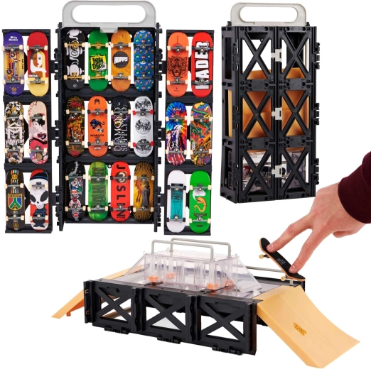 Uložte a predveďte svoju kolekciu fingerboardov s multifunkčnou sadou Tech Deck Play and Display. Odolné puzdro pojme až 24 dosiek a v okamihu sa premení na modulárny skatepark s funboxom a zábradlím. Súčasťou je originálny fingerboard ELEMENT. Ideálne na tréning trikov kdekoľvek – skladné, prenosné a maximálne zábavné. Ulož, prenes a jazdi!