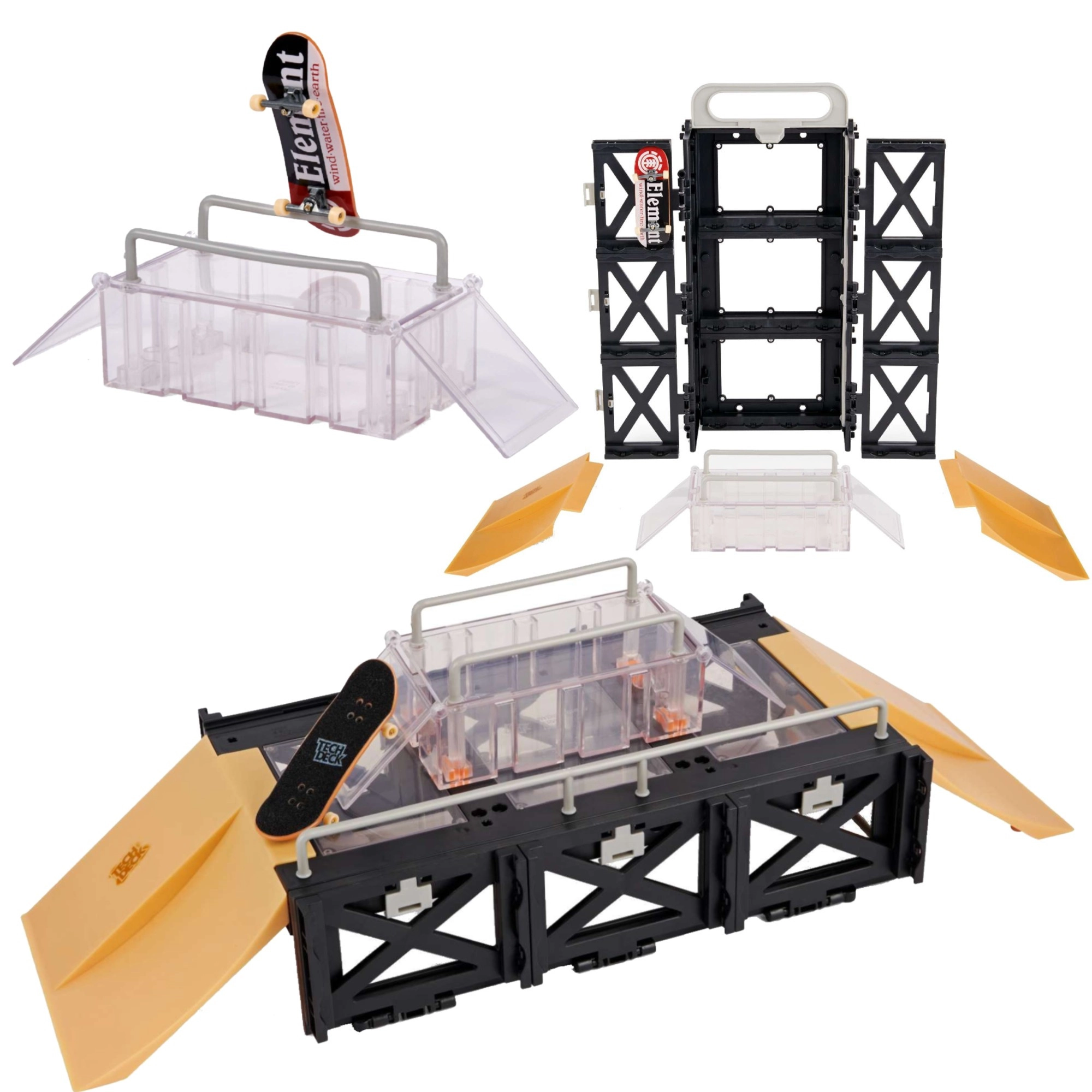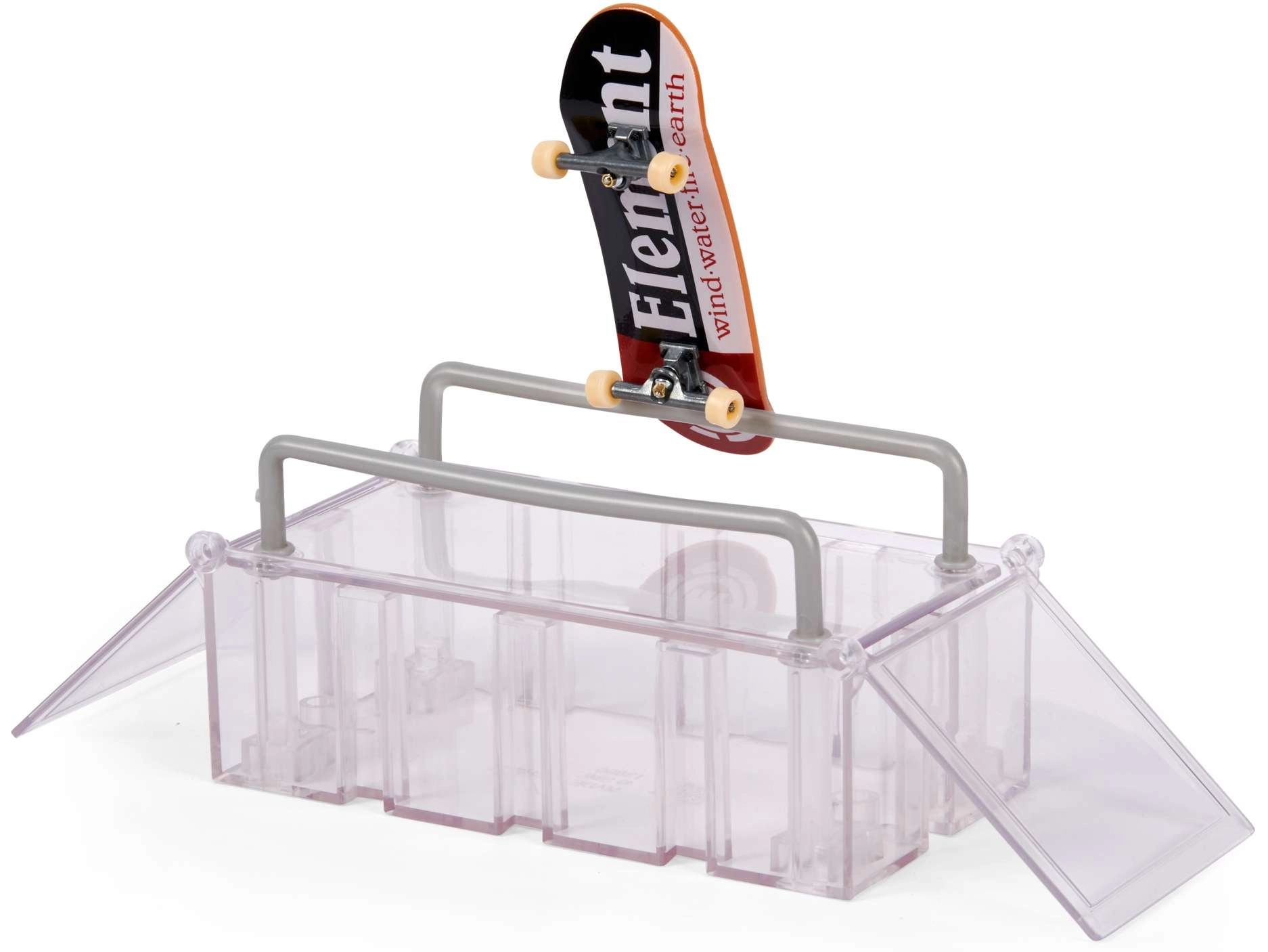 - 1× fingerboard Tech Deck ELEMENT, 1× puzdro/stojan, box so závesmi, 2× výklopný kicker, 4× vertikálna spojka, 1× pravý kicker s dvojitým zjazdom, 1× ľavý kicker s dvojitým zjazdom, 2× vysoké zábradlia, 1× dlhé zábradlie, návod