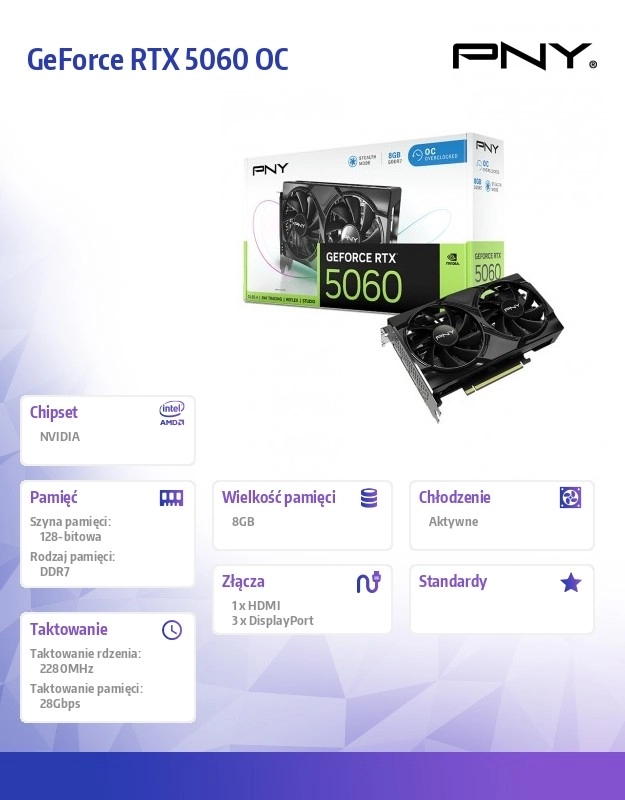Grafická karta PNY GeForce RTX 5060 prináša hráčom a tvorcom výnimočný grafický výkon, ktorý posúva hranice možností. Vďaka najnovšej architektúre NVIDIA Blackwell a technológii DLSS 4, môžete očakávať neuveriteľný herný zážitok s pohlcujúcou grafikou a vysokou obnovovacou frekvenciou.