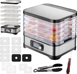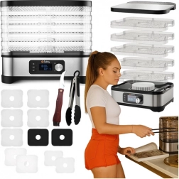 Univerzálna sušička RUHHY s výkonom 400 W je ideálna na sušenie húb, ovocia, zeleniny a bylín. S 5 táckami o kapacite 10 litrov, nastaviteľnou teplotou (35–70°C) a LCD displejom s programátorom na 72 hodín poskytuje efektívne a energeticky úsporné sušenie.