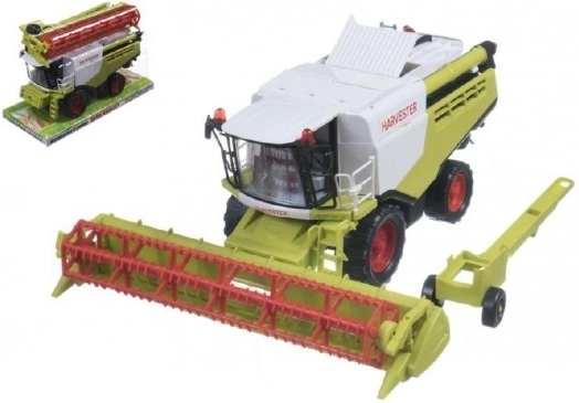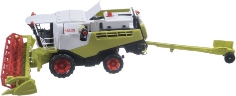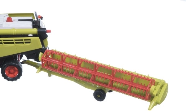 Detailne prepracovaný kombajn v šedo-zelenom farebnom prevedení s veľkou prednou radlicou. Tento model je vernou kópiou skutočnej poľnohospodárskej techniky.